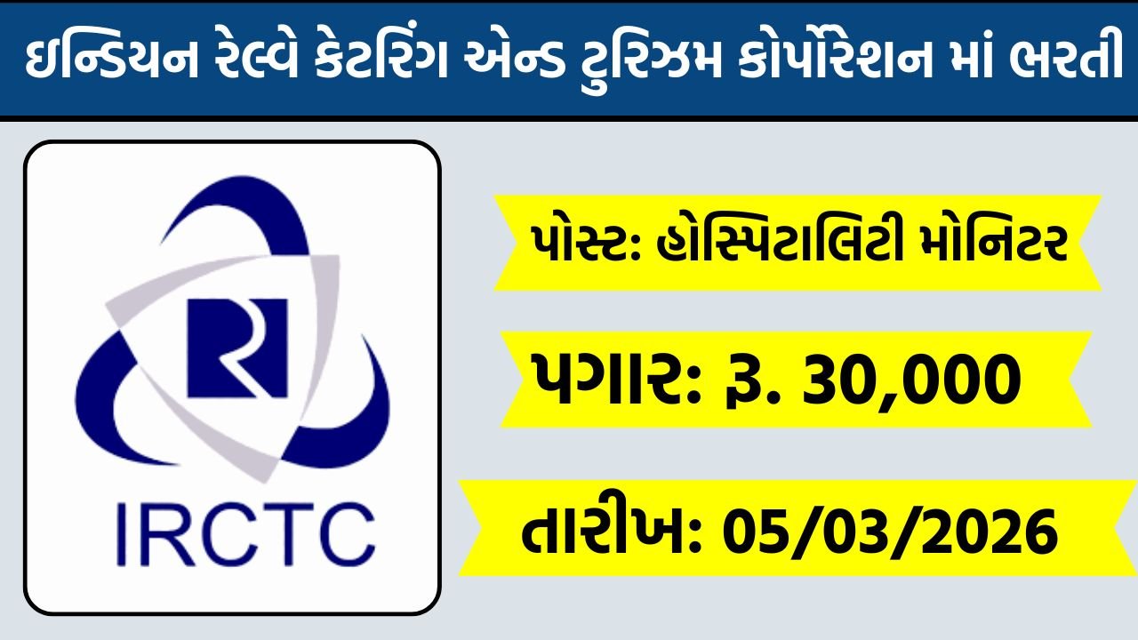 IRCTC Recruitment 2026: ઇન્ડિયન રેલ્વે કેટરિંગ એન્ડ ટુરિઝમ કોર્પોરેશન દ્વારા હોસ્પિટાલિટી મોનિટર ના પદો પર સ્ત્રીઓ તથા પુરુષો માટે ભરતી જાહેર