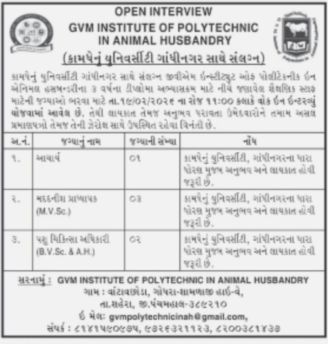 | 5 | ઇન્ટરવ્યૂ માટે ક્યાં આવવાનું છે? | GVM ઇન્સ્ટિટ્યુટ ઓફ પોલિટેકનિક ઇન એનિમલ હસબન્ડરી, ગામ: વાંટાવછોડા, ગોધરા-શામળાજી હાઇ-વે, તા. શહેરા, જી. પંચમહાલ – 389210 ખાતે ઇન્ટરવ્યૂ યોજાશે. |